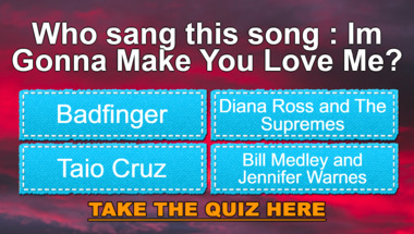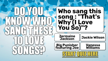4/10 is what people on average are scoring in this Love songs quiz so far. Are you ready to answer questions like "Who sang this song : "I'm Gonna Make You Love Me"?" and "Who sang this song : "So Sad (To Watch Good Love Go Bad)"?"