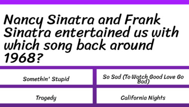 3/10 is the score to beat in this 1960s Songs quiz to put yourself over the average quiz taker. But you're probably going to be able to answer questions "Nancy Sinatra and Frank Sinatra entertained us with which song back around 1968?" and "Scott Mckenzie entertained us with which song back around 1968?" easy!