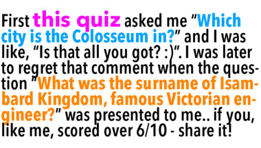 6/10 is the score to beat in this General Trivia quiz to put yourself over the average quiz taker. But you're probably going to be able to answer questions "Which city is the Colosseum in?" and ""It has dog-eared pages", means what?" easy!