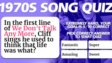 7/10 is the score to beat in this 1970s Songs quiz to put yourself over the average quiz taker. But you're probably going to be able to answer questions "Who had the hit "Crocodile Rock" in 1974?" and "Who had the hit "Can't Smile Without You" in 1979?" easy!